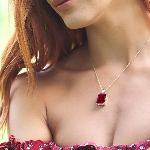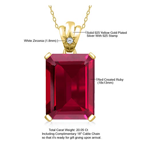 - MEASUREMENTS: 18x13mm Emerald Cut Red Created Ruby, 1.8x1.8mm Round White Zirconia. Total Carat Weight is 20.05 cttw.