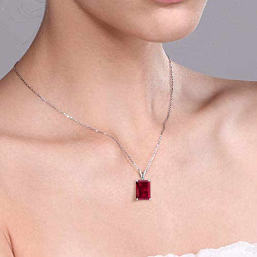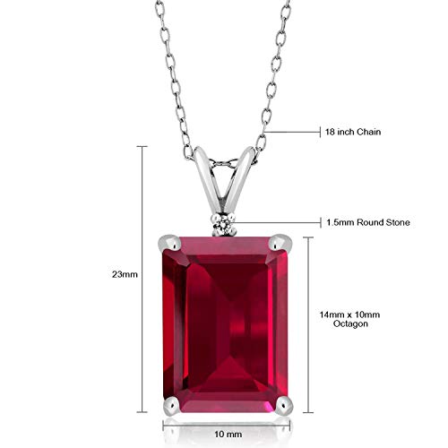 - MEASUREMENTS: 14x10mm Emerald Cut Red Created Ruby, 1.5x1.5mm Round I - J Diamond. Total Carat Weight is 5.02 cttw.
