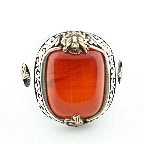 Details: Stone Size: 1.9 cm x 1.5 cm --- Stone Type: Red Agate (Aqeeq) --- Metal Type: Sterling Silver --- Other Metal Type: Bronze Details --- Weight: 9.60 grams All orders come in a special gift box. Please contact us if you don't see your size. We will do our best to obtain it from our warehouse or resize when possible.