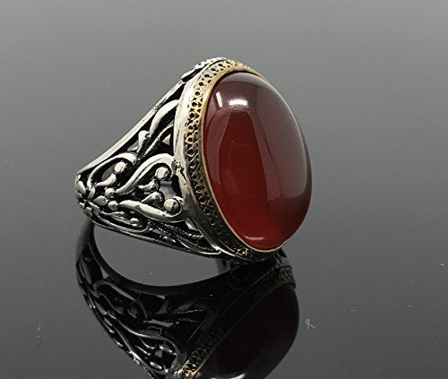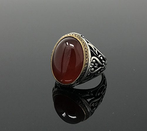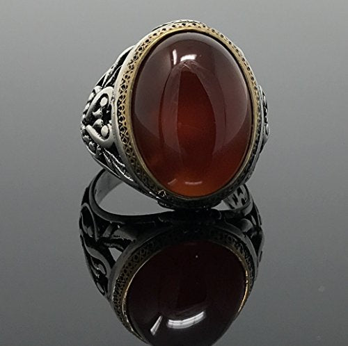 Details: Stone Size: 1.5 cm x 2.0 cm --- Stone Type: Reg Agate (Aqeeq) --- Metal Type: Sterling Silver --- Other Metal Type: Bronze Details --- Weight: 12.5-13.5 grams All orders come in a special gift box. Please contact us if you don't see your size. We will do our best to obtain it from our warehouse or resize when possible.