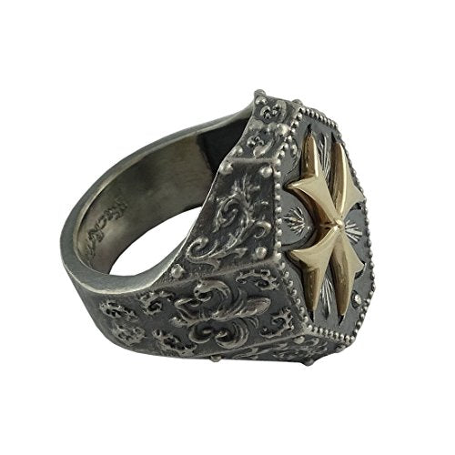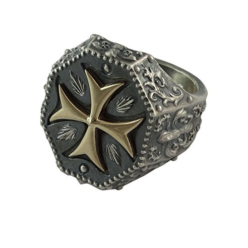 Details: Magnificent Knight Templar solid gold 10 K and solid silver 925, 2 tones Maltese cross custom made ring, Biker fashion style rustic/antique finish!!! Original and unique design with beautiful details, hammered silver bottom band stamped 10 K and 925 Rare piece nowhere else to be found, top quality, handmade, best craftsmanship This piece of beauty is absolutely handmade with precised fine lines done to perfection. That makes the ring very attractive and gives a different look from all the other standard pieces of jewelry out there on the market. There is the Maltese cross on the face of the ring, in Italy also known as the Amalfi cross, is the cross symbol associated with the Knights Hospitaller (the Knights of Malta). The cross is eight-pointed and has the form of four "V"-shaped elements, each joining the others at its vertex, leaving the other two tips spread outward symmetrically. Its design is based on crosses used since the First Crusade. It is also the modern symbol of Amalfi, (a small Italian republic of the 11th century). On each side of the ring there is the symbol "fleur de lis" which represents the Trinity of the Brotherhood. Top dimensions 20 x 23 mm. Weights around 19 grams depends on the size, 1.5 grams of solid gold. Don't hesitate to ask questions!