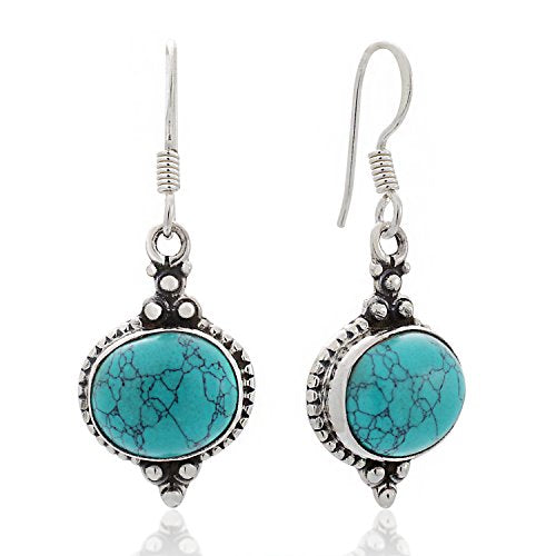 925 Sterling Silver Blue Turquoise Gemstone Indian Inspired Vintage Oval Dangle Hook Earrings 1.5"