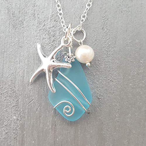 Handmade in Hawaii, Wire Wrapped Turquoise Bay blue sea glass necklace, Starfish charm, freshwater pearl, (Hawaii Gift Wrapped, Customizable Gift Message)