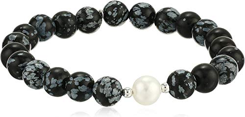 Genuine Semi-Precious Snowflake Obsidian Round Bead Stretch Bracelet with White Freshwater Cultured Pearl with Rhodium Plated Silver Accent, 6-1/2"