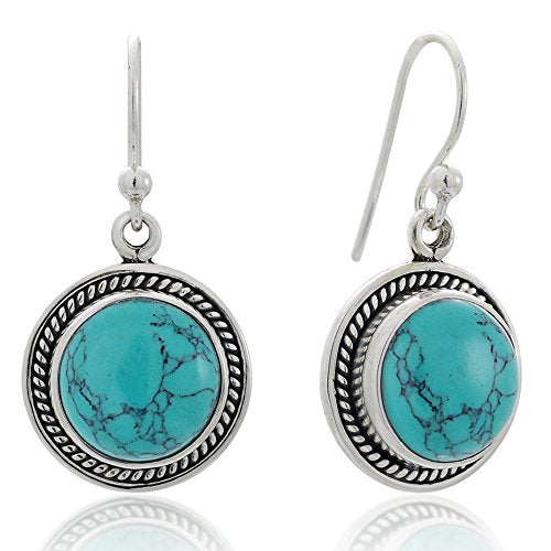 925 Sterling Silver Blue Turquoise Gemstone Rope Edge Round Dangle Hook Earrings 1.2"