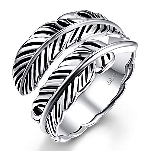 AVECON 925 Sterling Silver Adjustable Feather Ring Vintage Statement Leaf Ring for Women Men