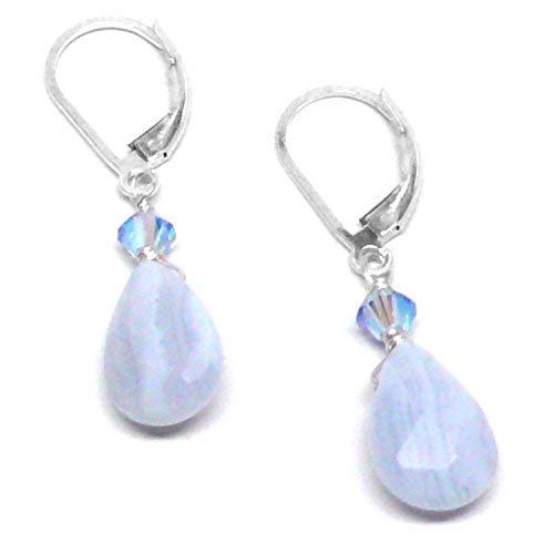 Blue Lace Agate Briolette Lever Back Earrings Swarovski Crystal Sterling Silver