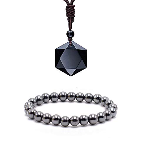 Black Obsidian Hexagram Natural Stone Pendant Necklace and Hematite Bracelet Hematite Metal Magnetic Therapy Bracelets