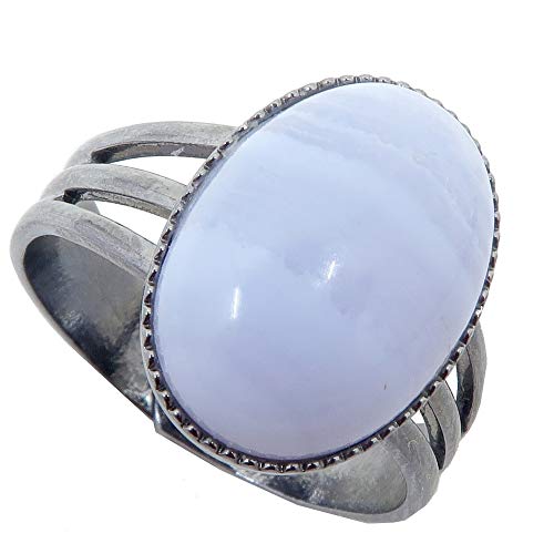 Agate Blue Lace Ring 4-10 Boutique Adjustable Metal Cool Blue Banded Gemstone Oval Crystal B02 (Gunmetal 14x10)