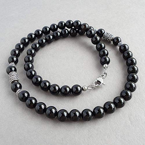 8mm Black Onyx Mens Necklace, Sterling Silver Accents, 18-24in Custom Length - Handcrafted in USA