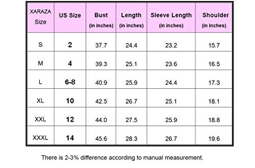 Details: Unique design, 100% brand new, high quality! The tag size is not US size. Such as US 2 = Tag S, US 4 = Tag M, US 6-8 = Tag L, US 10 = Tag XL, US 12 = Tag XXL, US 14 = Tag 3XL. Please refer to the measurement charts below to choose the correct size. Size Reference: Tag Size S----- US 2--------Bust(37.7")---Sleeve(23.2")---Shoulder(15.7")---Length(24.4") Tag Size M----- US 4--------Bust(39.3")---Sleeve(23.6")---Shoulder(16.5")---Length(25.1") Tag Size L----- US 6-8------Bust(40.9")---Sleeve(24.4")---Shoulder(17.3")---Length(25.9") Tag Size XL---- US 10-------Bust(42.5")---Sleeve(25.1")---Shoulder(18.1")---Length(26.7") Tag Size XXL--- US 12-------Bust(44.0")---Sleeve(25.9")---Shoulder(18.8")---Length(27.5") Tag Size 3XL--- US 14-------Bust(45.6")---Sleeve(26.7")---Shoulder(19.6")---Length(28.3") There is 2-3% difference according to manual measurement. Please note that slight color difference should be acceptable due to the light and screen. Garment Care: Hand wash or machine wash separately, and hang dry, do not bleach. What you get: 1 x Jacket 1 X Packable Bag