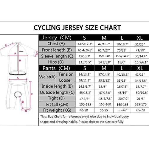 Details: Feature: 1. Material: Jersey 100% Polyester, Pants: 85% Polyamide & 15% Lycra & 3D Cushion Padded Shorts Tights 2. Breathable PN Mesh Fabric design for the jersey with good function for keeping drying and cooling 3. 3 Pocket on the back of jersey, convenience for carrying your personal stuff when cycling 4. Padded: 3D Cushion Padded Shorts Tights. 5. Coolmax Lycra fabric optimizes fit with its maxmized stretch 6. The Jersey never adhere to your skin, quick-dry function and make you feel more comfortable. Note:the size maybe exist someting error, Inevitably will bring something inconvenience to you please forgive us, if you have any questions, please contact to us. Package included: 1 x cycling jersey set