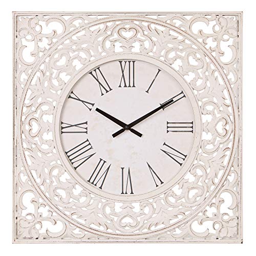 - Distressed white wood square wall clock with ornate cut out design crafted from wood