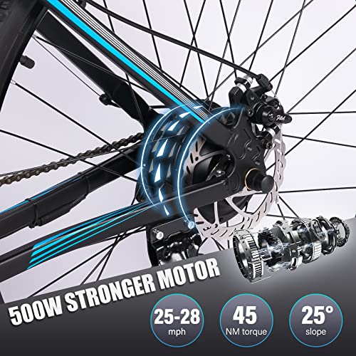 - 🎆500W 48V 28MPH POWERFUL MOTOR --- Equipped with 48V 500W high speed brushless motor, allowing it to reach speeds of up to 28MPH(please note will be affected by load weight and road conditions), Bicycle Weight: 62 LBS. Load Capacity: 330LBS, 29 X 2.1 strong anti-slip tire provide a safe, balance, fast and stable cycling experience for hill-climbing, daily commute or weekend exploring.