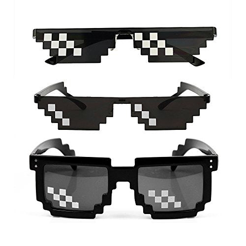 Details: Color: Black See-through pattern! Pixels cause very minimal vision obstruction. Bad-ass Thug Life look and feel - excellent Party Shades! Comfortable nose support - wear them all day! Perfect for MLG and Minecraft players - Funny gamer gift! Package Included: 3 x Thug Life Glasses 8 Bit Pixel Deal With IT Sunglasses