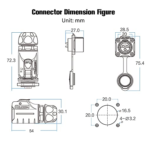 - 3 Pin Connector Specifications: The working voltage of the waterproof power connector can reach 400VAC, and the rated current is 10A. General wire diameter: Φ3.0mm~Φ9.0mm. Cable specification: 1.0 --1.5mm²/18-16 AWG. Contact resistance <2.5mΩ. Mounting dimensions: 16mm. Waterproof Protection level: IP67. Package list:2pcs( 2 male plug + 2 female socket)