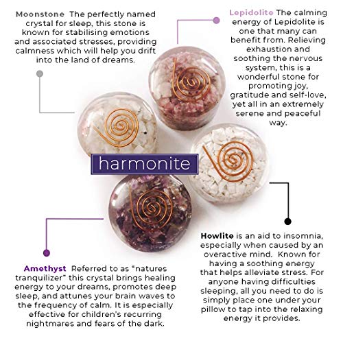 Details: Looking for better sleep, personal protection or inner peace? or maybe you want to surprise a loved one with an unusual and thoughtful gift? If so this beautiful orgonite set is for you. Handmade in India, one of the spiritual hotspots of the world. People travel from far off nations to India in search of enlightenment and bardic inspiration; this gift delivers some of that ancient spirituality straight to your door. Made with high quality, natural crystals; * Howlite is an aid to insomnia, especially when caused by an overactive mind. It is known for having a soothing energy that helps alleviate stress, tension and anxiety. * Amethyst Sleeping with this crystal brings healing energy to your dreams, promotes deep sleep, and attunes your brain waves to the frequency of calm. * Moonstone The perfectly named crystal for sleep, this stone is known for stabilising emotions and associated stresses, providing calmness which will help you drift into the land of dreams. * Lepidolite The calming energy of Lepidolite is one that many can benefit from. Relieving exhaustion and soothing the nervous system, this is a wonderful stone for promoting joy, gratitude and self-love, yet all in an extremely serene and peaceful way. Helps with negating the effects of harmful emf radiation Studied by Wilhelm Reich, Orgonite is believed to absorb and neutralize negative energy, making this gift more than just a beautiful set of healing crystals for the home, but a powerful defence against ever-increasing wifi and 5g radiation. Handy pocket size Protecting you and your loved ones wherever you go. Small enough to drop one into your kids school bag, another in your gym kit or leave one in the car for protection whilst on the move. Click add to cart now and remove all your night time worries!