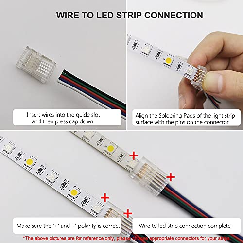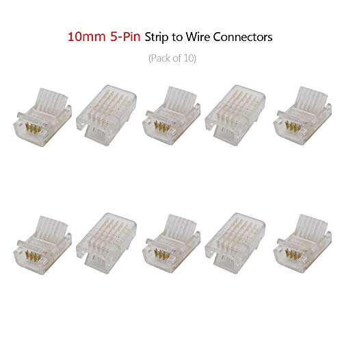 - SOLDERLESS AND CONVENIENT: Simply slot the strip light and 22awg wire into connector and clamp the cover. Fits all 10mm width 5050 RGBW LED strips. Perfect for NON-WATERPROOF or IP65 WATEREPROOF LED Tape Light DIY project. If used for 5-pin 12mm light strips, please choose another item. (ASIN:B09L7XSTL8)