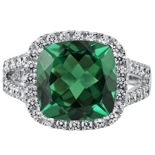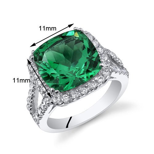 Details: Center Stone: Simulated Emerald, Cushion Shape, 11 mm, 4.75 carats, Rich Forest Green Hue with Brilliant Sparkle. Side Stones: 44 pieces Super Sparkling Machine Cut White Cubic Zirconia. Ring: 5.20 grams, Pure Sterling Silver with .925 Stamp, Ring features exceptional Design, Craftsmanship and Rhodium finishing. Perfect gift for Mothers Day, Birthdays, Valentines Day, Graduation, Christmas or just about any other occasion. Money Back Guarantee. Includes a Signature Gift Box. Available in Sizes 5 to 9. Style SR11084