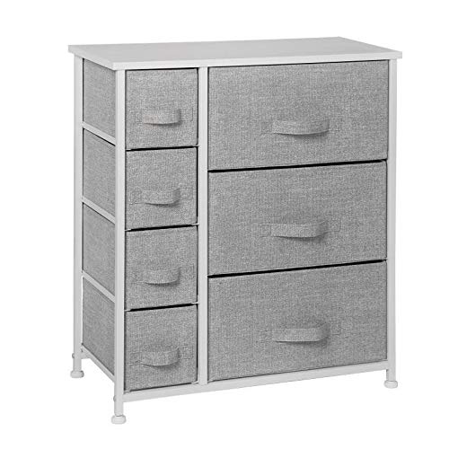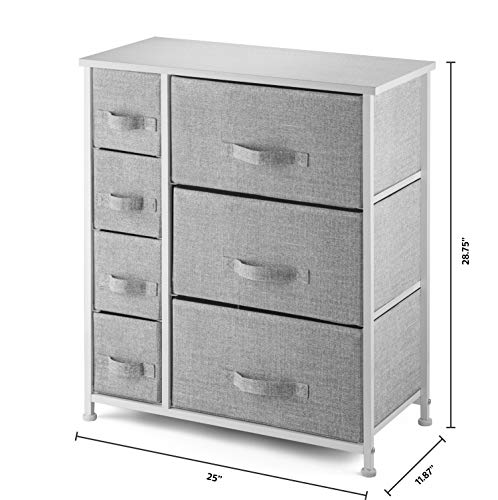 Details: 7 Drawers Dresser - Furniture Storage Tower Unit for Bedroom, Hallway, Closet, Office Organization - Steel Frame, Wood Top, Easy Pull Fabric Bins Gray / White