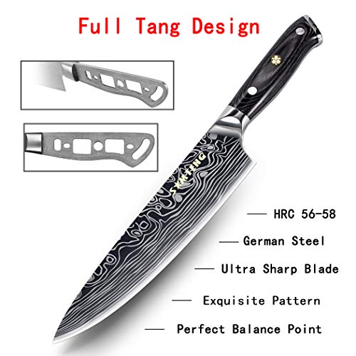 - Premium High Carbon German Steel: Precisely forged by High Quality German Steel, which contain 0.45-0.5% Carbon, 14-15% Chrome, after heat treating the HRC(Rockwell Hardness) reach 58 that make the blade Anti-Rust, Wear Resistant, Durability, Corrosion-Proof, Stain Resistant, Provide Healthy Kitchen Life.
