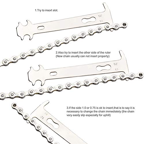 - CHAIN WEAR INDICATOR: To help you understand when it’s time to change the bike chain we include a chain wear checker and indicator to assess the condition of the chain. It’s simple to use, if the 0.75 or 1.0 tooth passes through the chain then it’s time to have it changed