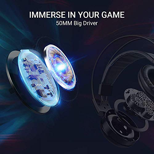 - 【Eye-Catching LED Effects & Noise-canceling Mic】This gaming headset has eye-catching RGB LED effects. Colorful RGB LED effects and gaming design add to the enjoyment gameplay. This unique lighting on the ear cups is designed to provide dazzling illumination. The noise-canceling microphone transmits your calls to the team in perfect clarity. Plus, it is built with on-ear audio control for quick, intuitive controls.