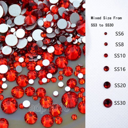 - Mixed Size: Our high end Crystal glass Rhinestone is the best result to Glue on surface of any bag,custom dress or clothes, cellphone's case, body arts, Nail arts, shoes arts, and any decorations. SS3 (1.3-1.4mm), SS4 (1.5-1.6mm), SS5 (1.7-1.8mm), SS6 (1.9-2.0mm), SS8 (2.3-2.4mm), SS10 (2.7-2.8mm), SS12 (3.0-3.2mm), SS16 (3.8-4.0mm), SS20 (4.6-4.8mm), & SS30 (6.2-6.5mm)