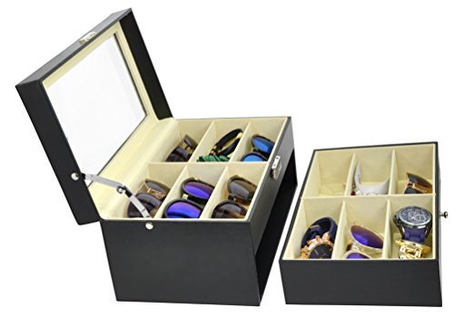 - EXCELLENT STRUCTURE: 2 layer 12 separate large compartments can keep your items organized. The transparent glass top allows you to see clearly inside the box and you can find your favorite treasure in seconds. It helps to beautifully display your collections and you can easily pick your favorite pair of glasses for any occasion.