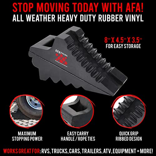 Details: Have you tried cheap plastic chocks that slip, crack or require pounding? AFA Chock Blocks have an aggressive ribbed design that grips your tires fast to give you the confidence to park on any downhill grade - or to use with wheel ramps on slick garage floors without fear of crushing. Just kick ‘em in place and walk away… that’s it. Here’s what you get: - 4 Wheel Chocks (2 Pair) enough for front and back of 1 axel. - Nylon reinforced rubber that’s 2-times stronger than old rubber designs that rip and tear. - Chock Blocks that won't crack, chip, slip and slide like cheap plastic options. - Wheel chocks that stand up to sun, sand, snow, mud, dirt, dust, and ice. - A textured bottom and ribbed top that grips your tires without the need to hammer or pound them into place. As you check out the pictures you'll notice the compact design. At 8 x 3.5 inches, with a 4.5-inch height, your Chock Blocks are small enough to toss behind the seat, yet tall enough to stop any sized tire from rollback (even truck tires). Also, notice the beefy handles. Unlike cheap options with eyebolts (that rust and bend), this large handle is made for easy grabbing, with extra room to tie your Chock Blocks together using rope for quick pullouts. Your order ships with 2 pair of dual wheel chocks that are perfect to keep your RV, Camper or Trailer in place while your away. But don’t take our word for it... Toss a pair of Chock Blocks under your car, truck, trailer, ATV, or RV tires, and join customers who say Chock Blocks give them the confidence to park on any incline, and in any weather with complete peace of mind that their wheels will stay put.
