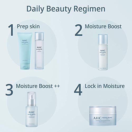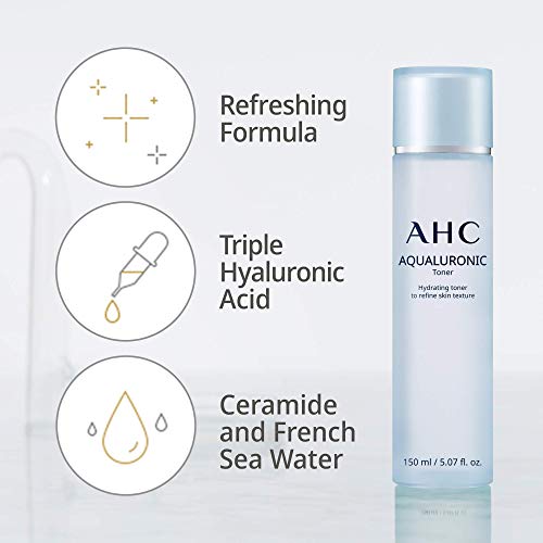 Details: Discover the K-Beauty secret everyone is talking about - Aqualuronic Face Toner from the innovative skincare brand, Aesthetic Hydration Cosmetics. This hydrating facial toner is expertly formulated to supercharge moisture-levels and quench thirsty skin. Its clever, triple-layered Hyaluronic Acid formula drenches skin in deep hydration, leaving it soft, plump and perfectly prepped for your next skincare step. Hyaluronic Acid is a true hydration hero as it holds up to 1000 times its weight in water. That’s why this Aqualuronic collection includes an advanced blend of Hyaluronic Acid with low, medium and high molecular weights, that penetrate the skin at different levels. The result is maximum, long-lasting hydration and radiant skin that looks lit from within. AHC skin toner, enriched with specially selected French seawater known for its mineral-rich properties, combined with moisture-trapping Ceramides, helps form a powerful moisture-lock barrier on the surface of the skin. After cleansing, dispense 4 to 6 drops of toner onto a cotton pad and gently apply it to the facial contours and then pat skin until absorbed. Originally developed for high-end aesthetic clinics in South Korea, AHC is a pioneering Korean beauty brand renowned for its premium ingredients, advanced cutting-edge technologies and luxuriously affordable skincare.