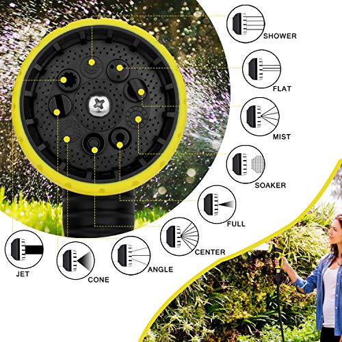 - 【9 PATTERN HOSE NOZZLE】:Our water nozzle with 9 pattern for more choices. The rubberized outer coating is non-slip and comfortable. Rotating bezel for easy choosing kind of nozzle. Buckle stent for uninterrupted use. Ergonomic handgrip for effortless operation. Its 9 spray patterns include: Full, Flat, Shower, Cone, Jet, Soaker, Angle, Mist and Center. Great for house/car/floor/yard washing, garden watering, pet cleaning or business use.