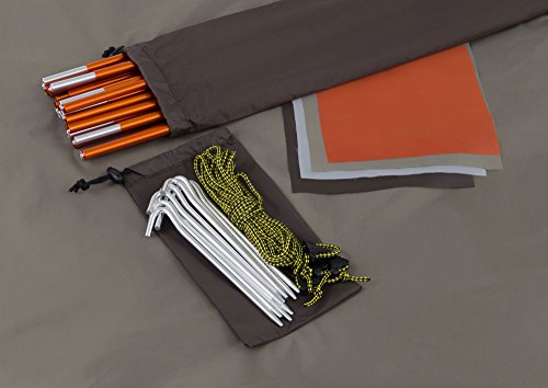 - Fully equipped with #8 zippers, storage pockets, gear loft, aluminum stakes, guy ropes and two doorways