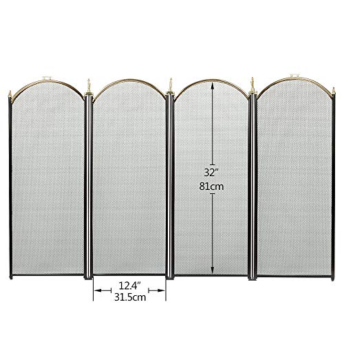 Details: DIMENSIONS: This crafts child fireplace screen mesh measures 32-inch in height, 51-inch (fully expanded) in width, great fire place cover choice, matches with home decor, most fireplace grates, fire place tools and curtain holders, gas or grass, electric fireplaces. HIGH QUALITY: Gold wrought iron fire place screens comes with 4 single hinged panels in arched design can stretch to fit different openings. Essential decorative fireplace cover gate accessories constructed similarly with traditional brass and black fireplace enclosure, heavy duty pivacy firescreen for baby toddlers safety proof fencing or indoor Christmas tree fence protector on Christmas day. STURDY FIRE SCREEN: High metal steel fire place screens with doors holds firmly to the hearth ground, even for outdoor portico, fire pit, fireplace areas, it is also a good choice to your friends as christmas gift. SPARK GUARD: Large and solid fire place gate to block popping embers; mordern fire place guard baby proofing tree with rustic chimney standing, keeps your kids and puppies away from the fireplace and keeps the living room safe. ONE-YEAR WARRANTY: Heavy duty medium fireplace doors and screens repaired parts shall be covered within the Limited Warranty Period.