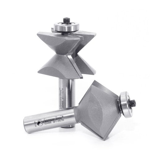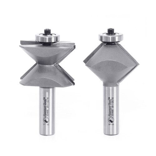 Details: Product Description This two-piece bit set provides an economical way to create your own edge banding from the wood of your choice. This is a great way to create a finished edge on plywood or MDF panels and shelves which blends perfectly with the rest of your project.Using this bit set is simple, too. Just position Each bit so that it is centered on the stock thickness and make the cut. For the best results we recommend that you cut the edge band stock slightly oversize and then flush trim it After assembly, #55466, diameter (D): 1-25/32, angle (a°): 90°, cutting Height (B): 1-1/32, Shank (d): 1/2, overall length (L): 2-21/32, D1: 1-13/16, 55466 2-piece carbide Tipped edge banding 90 deg X 1-25/32 dia x 1-1/32 x 1/2 inch Shank set From the Manufacturer Since 1972, Amana Tool has been producing router bits and has become the global leader in its field. In fact, the company was the first manufacturer to produce router bits according to the Holz BG German standard for safety and quality. This standard contains rules that determine the structure and quality of the tool's material in order to create the safest environment for the user. From its beginning, Amana Tool has always used the highest quality materials, and its tools are produced using unique technologies, a majority of which were developed and built by the company's engineers following decades of testing and experience. For example, Amana Tool uses carbon alloy steel for its router bits that contains vanadium particles. This improves the structural integrity of the steel and prevents corrosion and defects in the internal structure of the material that can lead to cracks and breaks. High-tech machinery processes the carbon alloy steel to manufacture the router bodies in a single clamping. This yields router bits with superior balance, centricity, precision and symmetry. This 90 Degree 2-Piece Edge Banding Router Bit Set provides an economical way to create your own edge banding from the wood of your choice. This is a great way to create a finished edge on plywood or MDF panels and shelves which blends perfectly with the rest of your project.