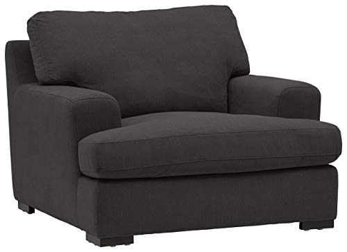 Details: An Amazon Brand - Soft down-filled cushions on a frame of solid hardwood mean this armchair offers plush support and security. Neutral pepper-colored upholstery allows this piece to blend into your existing color scheme with ease.
