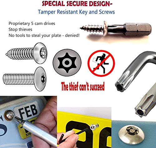 Details: Has your license plate been stolen in your community?Has the police notified the car license that it needs to be secured?PLATE SCREWS PREVENT THEFTďźLicense plate theft can be a major headache, as your plate can be used to commit a crime, Tamper Resistant Licence Plate Kit, Specially designed to prevent license plate theft.Wake up in the morning, found the license plate was stolen, license theft may be a headache! Because your plate can be used to crime, tamper-proof license kit, designed specifically to prevent license theft, plum-shaped special wrench difference ordinary hex Wrench, thieves no door.What you can get:Anti-Theft Self Tapping Security Screws and Flat Head Fasteners Kit + Tool Wrench + Black Screw Caps and Silver Screw Caps + Anti-scratch foam padsThe combination of the pin, located in the middle of the allen screw, and the special Cruiser key makes it impossible to remove the Stainless Steel Tamper Resistant Screws even though thief have a typical allen wrench.Our RUST & FADE FREE screws are Made of high quality Never rust 304 stainless steel, your license plate frame will be brand new after years of use. Come with Black Screw Caps and Silver Screw Caps, your license plate frame will be a plus protection.Why choose Our 100% stainless steel license plate screws? Because of CORROSION and OXIDATION RESISTANCE. It has excellent resistance to a wide range of atmospheric, chemical, petroleum, and environmental exposures.30 years history of manufacturing license plate frame, our rich experience is just for one purpose : protect your license plate in security!Installation is simple, a few minutes to solve the biggest thief trouble .