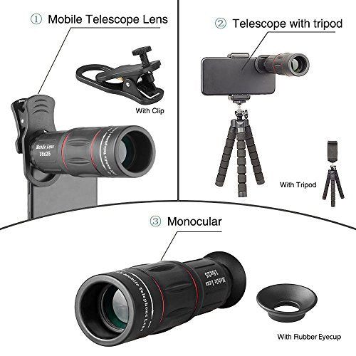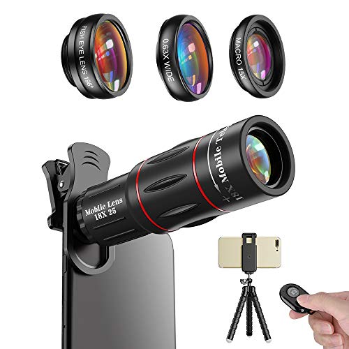 - 【Your smartphone got smarter】 18X telephoto lens - Magnify distant subjects. Fisheye lens - Create fun and unique circular mystical results picture. Macro lens - Capture close-ups of flowers, insects and other small objects. Wide angle lens - Capture a wide field of view for stunning perspectives with virtually no distortion. With tripod and shutter, blurriness is eliminated from shaky hands, or windy days.