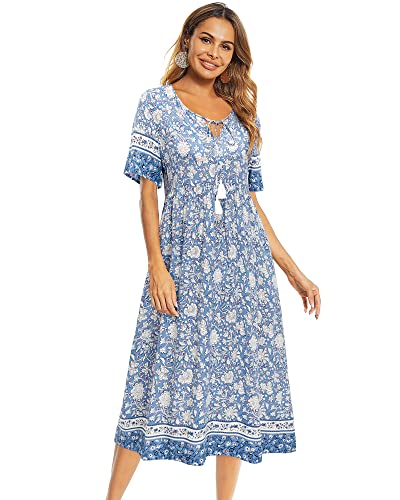 - TRENDY SUNDRESS FOR EVERYONE - This summer bohemian dress is designed with tassel tie neck that you can adjust it to meet you needs, and loose flowy style make you look casual and chic. Round neck dress with ethnic floral print make you look charming and attractive