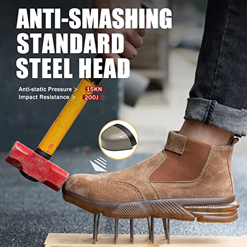 - ▶【New Upgrade High Quality】- Steel toe work boots can provide protection against 200J of energy. The high-top upper adds padding at the ankle, strong wrapping feeling, gives you extra protection for the ankles. Much lighter than traditional work boots, reduce stress and fatigue on the legs and joints throughout long workdays.