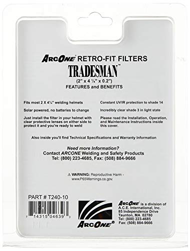 Details: ArcOne Tradesman Auto-Darkening Filter 2-Inch x 4-1/4-Inch x 2-Inch - Horizontal is an economical, general use auto-darkening filter. Great for the do-it-yourselfer and home hobbyist. This 2X4-inch filter has a light state of 3 and single shade 10.5.