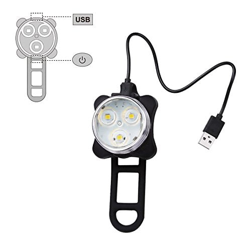 Details: This small yet bright LED bike light gives you and your family the protection you need whether cruising down a crowded paved road or enjoying the nature in the wilderness. Choose white for the front headlight or red for the rear taillight. 4 Light Mode Options and Discharge Time of Full-charging Head Light: 3.5hr (full brightness) ,10hrs (half brightness), 10.5hrs (slow flashing), 10hrs (fast flashing) Tail Light: 2.5hr (full brightness) ,9hrs (half brightness), 9.5hrs (slow flashing), 9hrs (fast flashing) How to Charge 1. Attach the micro USB cable to the Bike light's micro USB input port 2. Insert the other end of the cable into either an AC adapter (not included ) connected to a wall socket or an active computer USB port 3. The LED indicator of front light will turn to be green when the front light is fully charged and the rear light has an orange hue when finished Package Contents 1 X Head light (white light) 1 X Tail light (red light) 2 X USB cables 4 X Silicone mounting Strap 1 X Instruction Manual