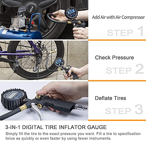 - ALL-IN-ONE FEATURES: The LED backlit screen features measurements in PSI, KPA, Bar, and Kg/cm^2; Includes an inflator, straight locking chuck, gauge, hose, and bleed valve, all in one unit; Compatible with both ¼” and ½” NPT air compressors outputs