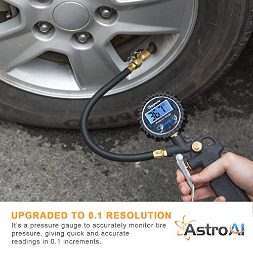 Details: Fill it Right the First TimeThe AstroAI Digital Tire Inflator Gauge makes filling tires extremely easy when using an air compressor. Instead of filling a tire, check the pressure, adjusting, checking, and repeating over and over again, simply fill the tire to the exact pressure you want. Fill a tire to specification twice as quickly or even faster by using fewer instruments! Save time and just fill it right the first time.High Quality ConstructionThe first thing you'll notice about this gauge is its weight; only high quality stainless steel and brass was used to provide an extremely heavy duty inflator gauge that can withstand up to an incredible 250 PSI. The rubber hose is insulated and extra thick for superior performance.SpecificationsInflation Range: 0-250 PSIAccuracy: ±1%Display Resolution: 0.1 PSIDisplay Type: Backlit LCDMeasurement Units: PSI, KPA, Bar, Kgf/cm2Compatibility: NPT air compressor connectorPackage Contents1 x AstroAI Tire Inflator Gauge1 x User Manual4 x Valve Caps1 x Brass Air Chuck2 x AAA Batteries1 x ¼” NPT Steel Fitting1 x Thread Seal Tape Roll1 x Valve Core Tool