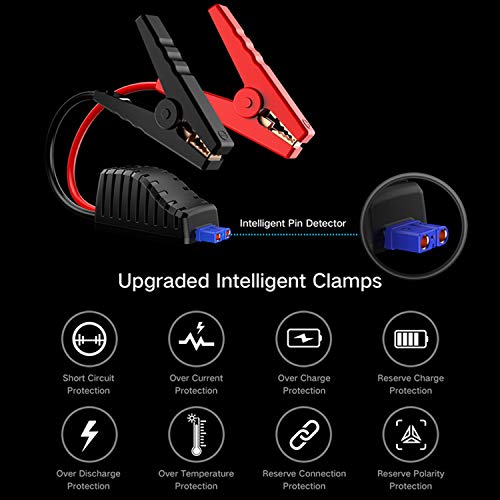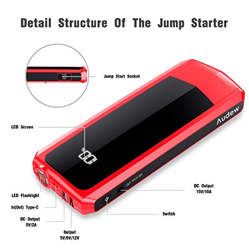 - 【IMPROVED SAFETY TECHNOLOGY】Audew auto battery booster used advanced intelligent IC technology to protect your safety.Improved terminals could provide reverse polarity protection, over-current protection, overload protection, over-voltage protection, over-charge protection.Just feel free to jump your car.