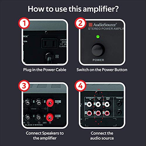 Details: Experience the vibrancy of our home sound system. A great sound system relies on a great amplifier--they’re an integral element to a full soundscape. Create a multi-room audio environment, build a home theater, or expand your system to the outdoors. Our gold standard Class A amplifiers will fit your every need. This Power (A) AMP100VS system has 2 channels rated at a power output of 50 watts into 8 ohms. It has a power output of 60 watts RMS per channel into 4 ohms. 150 watts are bridged to an output at 8 omhs. Born out of Portland, Oregon, AudioSource began designing and manufacturing high-grade, affordable, and great sounding audio products in 1978. Our goal is to exceed your expectations for value and performance. Specifications: Input Sensitivity: Variable, .7 Vrms for rated power at 8 ohms. Frequence response: 10Hz to 30kHz. Channel Crosstalk: 70 dB. Less than 0.2% THD into 8 ohms at rated power. S/N Ratio: 100 dB A-weighted.