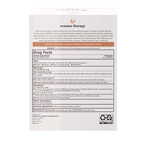 Details: Aveeno Baby Eczema Therapy Soothing Bath Treatment helps relieve minor skin irritation and itching caused by rashes, eczema, poison ivy, poison oak, poison sumac, or insect bites. From the dermatologist and pediatrician-recommended brand, this baby bath treatment is indicated to relieve dry, itchy, irritated skin and is accepted by the National Eczema Association. The unique formula of this tear-free and allergy-tested baby eczema therapy bath combines natural colloidal oatmeal skin protectant with a special moisturizer to help provide baby with dry skin relief. When dispersed in water, the ultra-fine powder forms a milky soothing bath that also works as a natural, soap-free cleanser and is gentle enough for delicate skin. After bathing, your baby's skin becomes softer and smoother, and dry irritated skin is relieved. Aveeno Baby Eczema Therapy Soothing Bath Treatment is gentle on eyes and free of steroids, soap, parabens, phthalates, phenoxyethanol and fragrances.