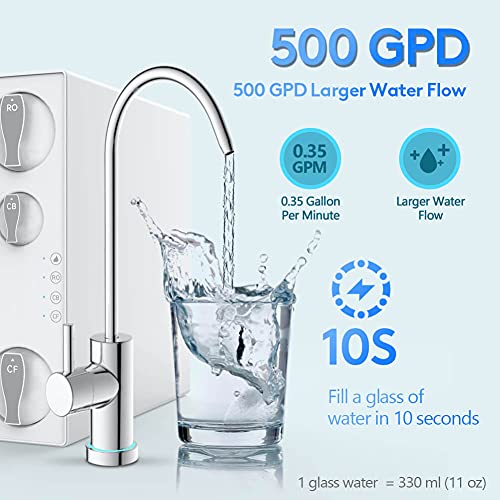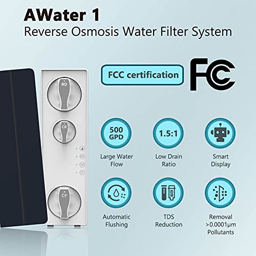 - 500 GPD High Water Flow: AWater 1 RO water filter system can produce up to 500 gallons of water per day. Meet the daily water needs of large families. The water flow is fast and stable, and a glass of 330ml of water can be filled in about 10 seconds.