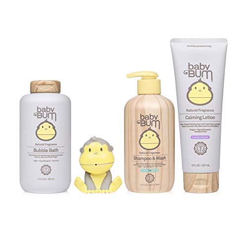 Details: Our Baby Bum Bath Time Gift Set includes all of the essentials for a fun bath time routine and makes the perfect baby gift. This Bath set includes (1) Baby Bum Gel Shampoo & Wash, (1) Baby Bum Bubble Bath, (1) Baby Bum Everyday Lotion, and (1) Duke bath toy. Transform bath time into a memorable bonding experience for you and your rad little kids. Start with Baby Bum Bubble Bath that is formulated with gentle ingredients from the earth and sea that create perfect tear-free bubbles for nonstop foamy fun with the Duke Bath Toy. Cleanse and moisturize with Baby Bum Gel Shampoo & Wash that is formulated with moisturizing ingredients such as monoi coconut oil, aloe and white ginger to hydrate and soothe sensitive skin. Follow up with Baby Bum Everyday Lotion that is made with our plant-based formula that contains aloe, shea butter and cocoa butter to nourish and hydrate all skin types. All items are formulated with high quality, natural ingredients and pediatrician and dermatologist approved.
