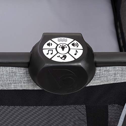 Details: The Baby Trend Retreat Twins Nursery Center playard is the perfect solution for parents with twins. It features two removable Rock-A-Bye Bassinet side by side, with their own canopy and carry handle, plush fabric and mesh sides for proper ventilation for removability. Each bassinet includes 2 toys. The playard includes a removable full bassinet, changing table, a deluxe parent organizer. Easy one-hand locking mechanism makes the playard stable and it can be moved from place to place with large wheels and secured with brakes. Also included is a convenient travel/storage tote bag. Your baby will enjoy the electronic music center with volume control, nightlight, and vibration which includes two styles of music and nature sounds. Items in the parent organizer are not included.